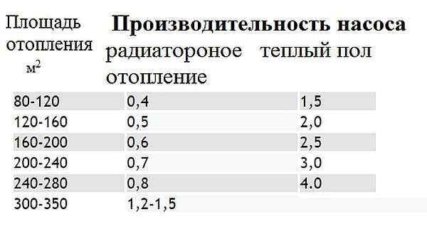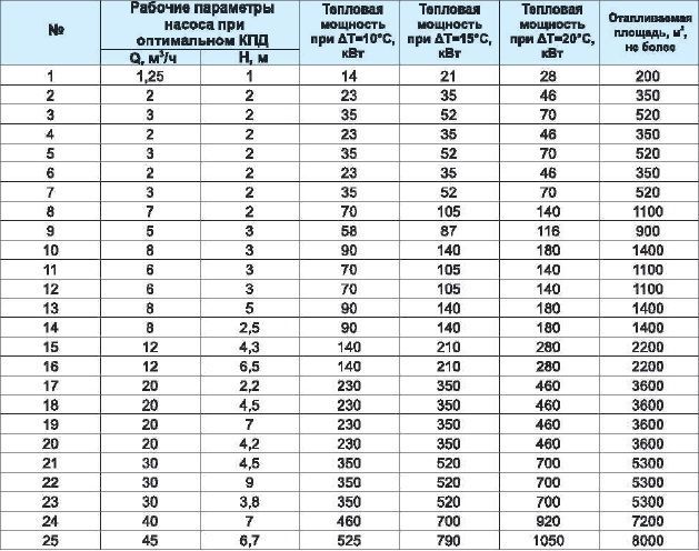 La capacité est déterminée par le volume d'eau passé par unité de temps (m3 par heure). Le choix d'une pompe appropriée pour le chauffage par le sol peut être fait à l'aide du tableau.