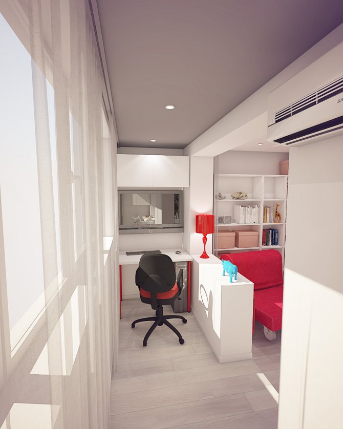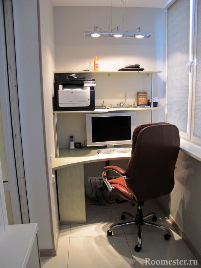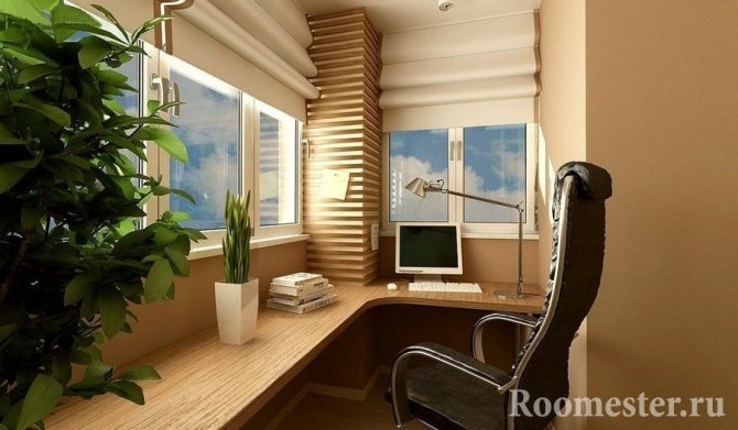 Cette option est également pratique du point de vue de l'éclairage. Pendant la journée, vous n'avez pas besoin d'allumer les lampes en plus. En été, les travaux se dérouleront pratiquement à l'air frais. La conception correcte et compacte de l'espace de travail permettra même depuis le balcon étroit du Khrouchtchev de créer un bureau fonctionnel séparé dans un appartement d'une pièce.
