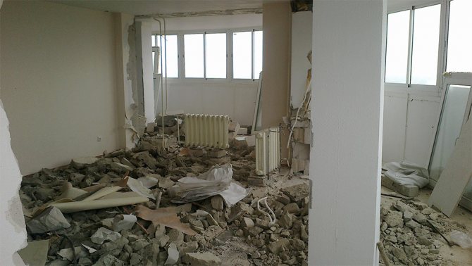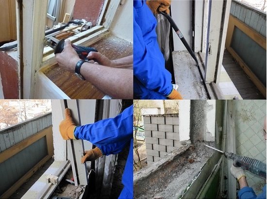 Coupez les supports de batterie et retirez-les, puis coupez les tuyaux. L'étape suivante consiste à affaiblir la cloison, pour la mise en œuvre de laquelle il est nécessaire de percer un grand nombre de trous traversants à l'aide d'un perforateur avec une perceuse et, armé d'un marteau, casser le rebord de la fenêtre. Si un renfort est trouvé, il est découpé avec une meuleuse. Une fois les activités de démontage terminées, l'ouverture résultante est finalisée à la forme et à la taille souhaitées, et la différence de sol est nivelée.