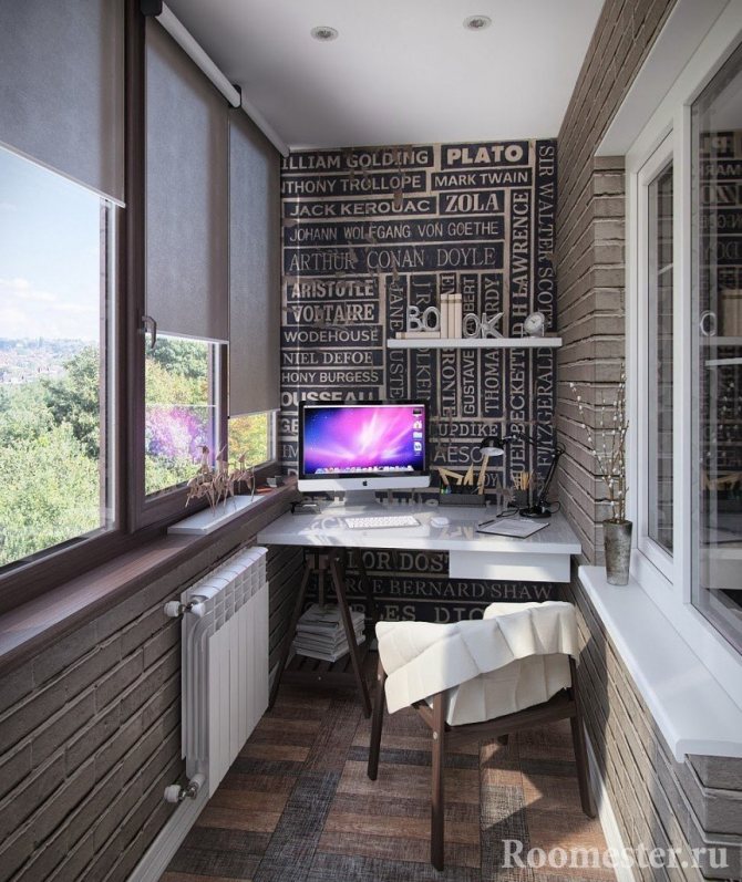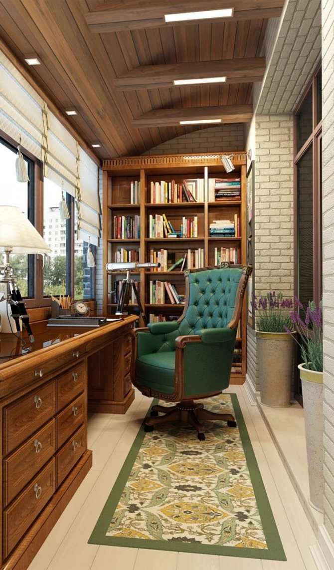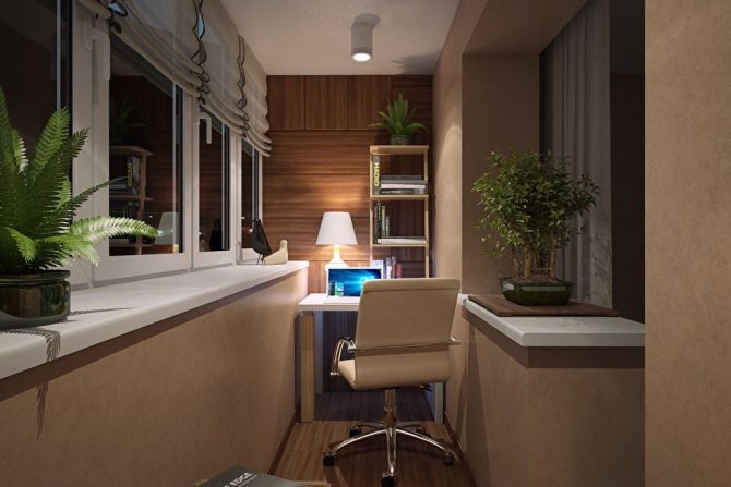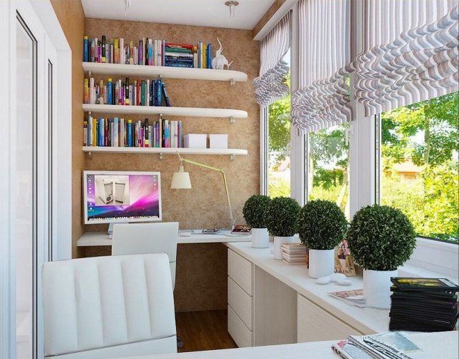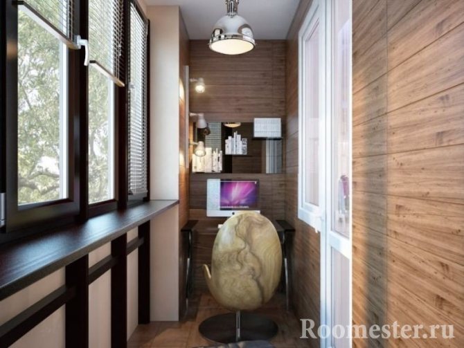 Pour ceux qui travaillent beaucoup à la maison, mais qui n'ont pas leur propre coin privé, un balcon sera une excellente solution à ce problème. Un petit bureau, une chaise de bureau et même un canapé sont placés dans une telle pièce. Tous les documents, livres et autres outils nécessaires au travail peuvent être facilement répartis sur les étagères jusqu'au plafond.
