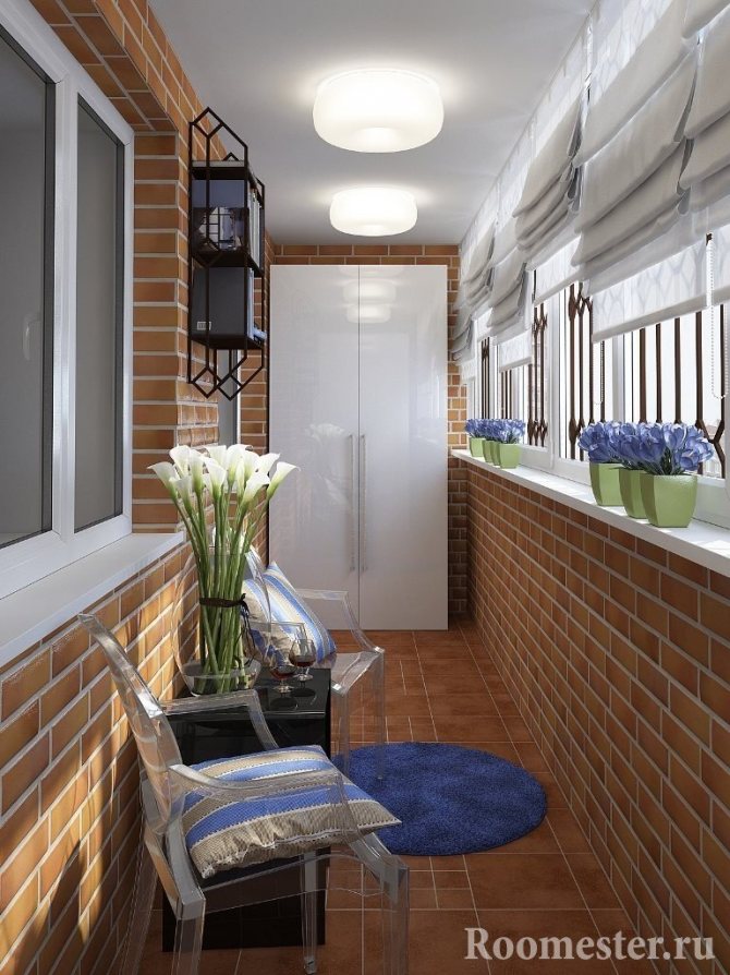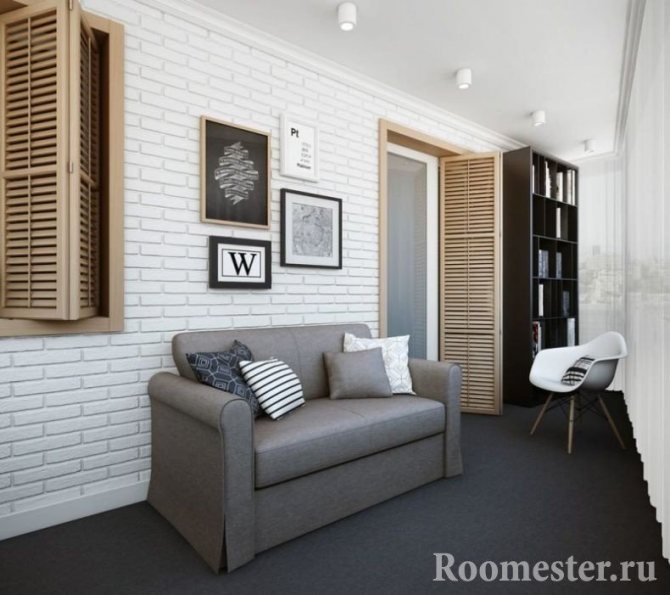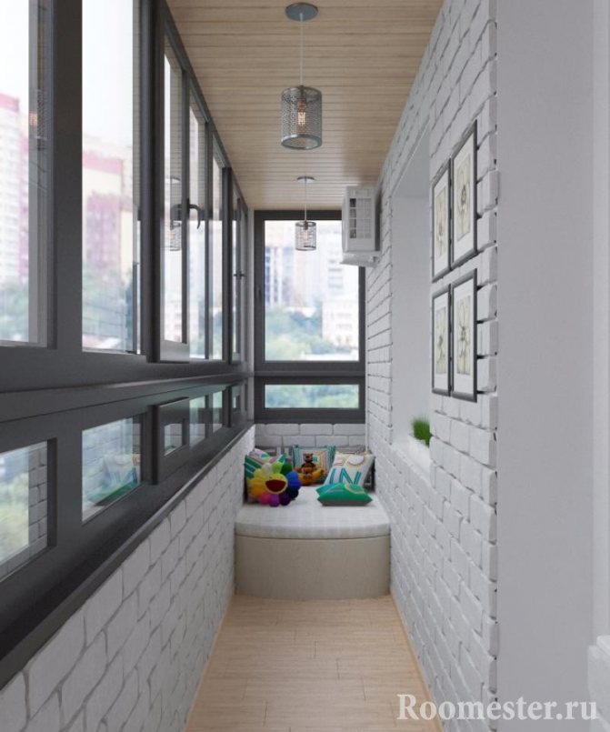 Sur les balcons en brique, les murs sont parfois laissés dans leur forme d'origine. La conception moderne des pièces propose souvent cette idée comme une solution originale. La brique est traitée de manière spéciale: elle est nivelée, apprêtée et peinte. Un tel mur de briques deviendra lui-même un élément décoratif. Dans ce cas, la texture de la brique peut être parfaitement lisse, rugueuse ou combiner harmonieusement différents types de textures et de couleurs.Une galerie de photos dans des cadres métalliques ou une série de peintures abstraites aura fière allure sur une surface rugueuse.
