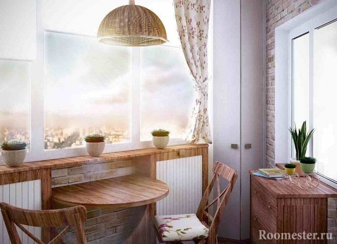 Le balcon fait parfois une extension de la cuisine, si la pièce est très petite et ne permet pas de combiner le coin repas avec le coin cuisine. Une partie du bloc cuisine peut être placée sur le balcon, elle peut servir de salle à manger, si l'ancien rebord de fenêtre est décoré sous la forme d'une table à manger. La même partie sera reclassée en comptoir de bar, qui deviendra un ajout stylé en cas de fêtes à la maison.
