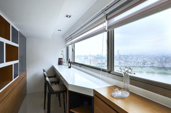 Dans ce cas, la rallonge peut atteindre jusqu'à 40 cm.C'est au bord des supports qu'un profilé en bois ou en métal (coin ou canal) est fixé, sur lequel une fenêtre en aluminium est installée. La suppression permet d'augmenter la fonctionnalité de la pièce en construisant un rebord de fenêtre assez large.