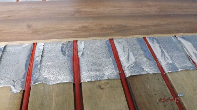 De plus, une isolation sous le stratifié sur le sol en béton peut être posée entre les poutres, et une chape sèche peut être réalisée sur le dessus et un substrat peut être posé. Pour éviter que le niveau du sol ne monte très haut, vous pouvez poser un mince film d'isolation thermique avec une couche d'aluminium. Ce matériau est collé sur des sols plats avec un composé spécial.