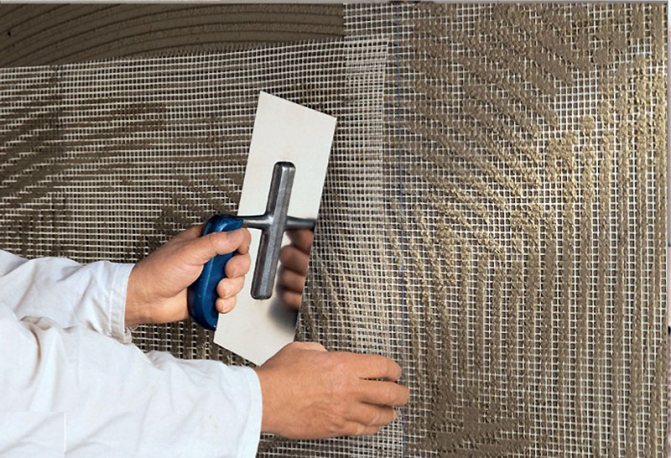 Ensuite, une couche de colle doit être uniformément appliquée sur la surface de l'isolation thermique et un treillis de renforcement en fibre de verre avec des cellules de 3 à 6 mm doit être pressé dedans. Une fois le mélange séché, une couche de nivellement adhésive d'une épaisseur de 2 mm doit être appliquée sur le revêtement et les coins doivent être renforcés avec un profilé galvanisé perforé.
