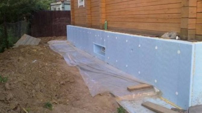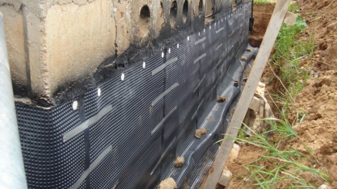 Pour cela, la fondation est creusée sur tout le périmètre, déblayée du sol. Après cela, toutes les fissures sont éliminées dans la base et l'imperméabilisation est installée. La protection contre l'humidité peut être réalisée par une méthode d'enduction, par exemple avec du mastic bitumineux ou par collage avec des matériaux d'étanchéité (en option, matériau de couverture). L'isolation est coulée dans la tranchée et une chape en béton est coulée.
