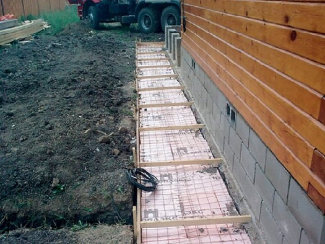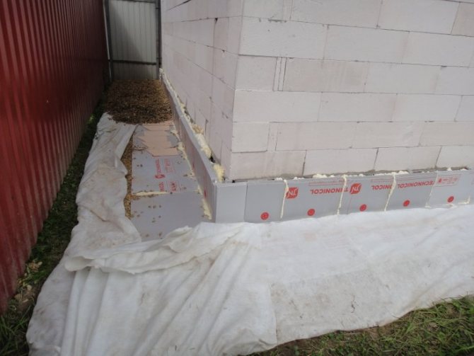 Une suite logique sera la pose d'isolant sous la zone aveugle, qui est créée autour du bâtiment et créera une barrière au gel des murs et protégera contre le soulèvement du sol par le gel.