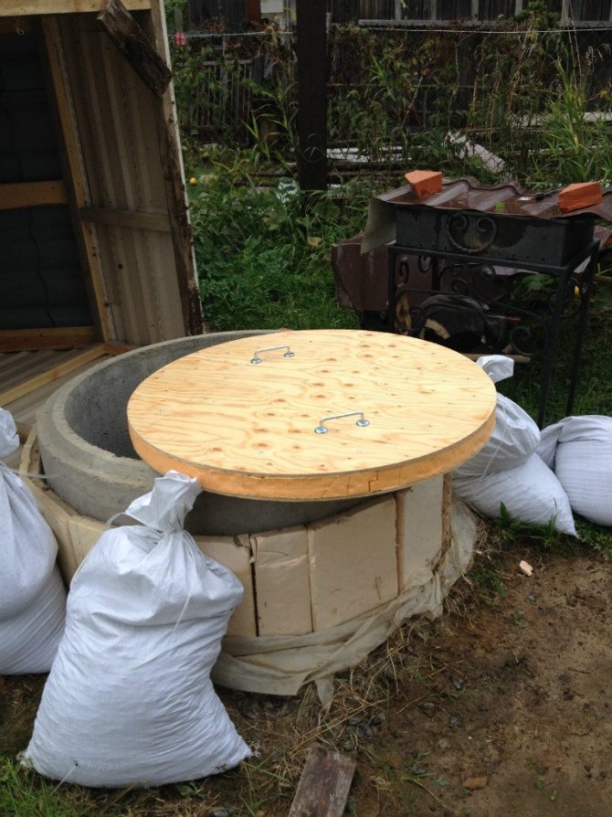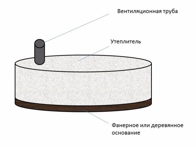 - le deuxième panneau de contreplaqué est également isolé et placé 80-110 centimètres au-dessus de l'isolant. Les experts ne sont pas d'accord: certains recommandent de fabriquer un coussin d'air, d'autres - de poser le couvercle directement sur l'isolant. Dans tous les cas, si le couvercle supérieur est au-dessus du niveau du sol, l'extérieur du puits doit être isolé.