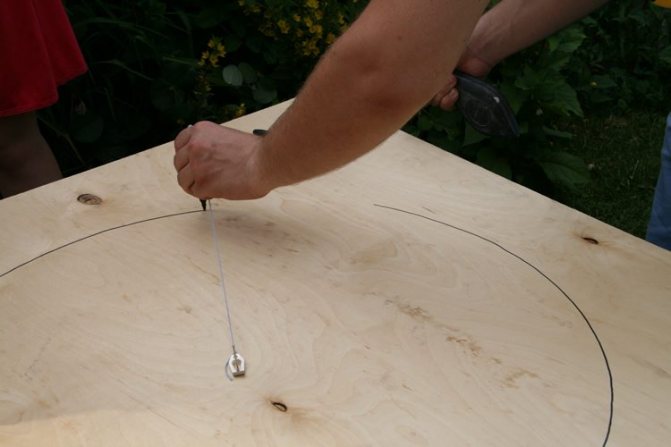 La première étape. Prenez une feuille de contreplaqué et découpez une paire de cercles réguliers d'un diamètre similaire au diamètre de la structure elle-même. Faites deux trous dans chaque cercle - un pour le tuyau et l'autre pour la ventilation.