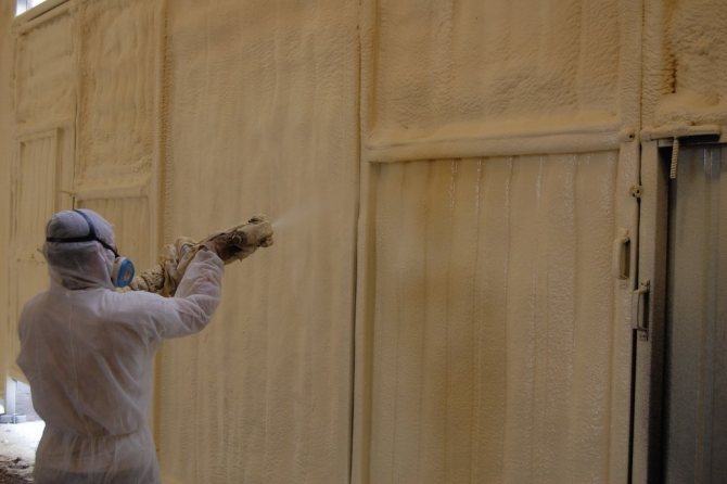 Certaines difficultés sont causées par la nécessité d'utiliser un équipement spécial pour l'application. L'ensemble d'appareils se compose de deux cylindres avec des substances dont les tuyaux sont détournés, qui sont connectés en un seul et attachés au dispositif de pulvérisation. Le coût du matériel professionnel est très élevé, mais le matériel peut être loué. Et il convient également de considérer que la structure a une faible perméabilité à la vapeur, ce qui est particulièrement important pour un type de matériau rigide. En conséquence, les murs sous l'isolation et la décoration intérieure sont exposés à la pourriture.
