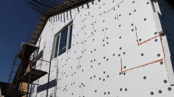 Une fois que tout est sec et que le cadre isolant devient solide, vous pouvez commencer à finir la maison. S'il s'agit d'un plâtre lisse ou texturé, un renforcement des murs avec de la colle sera nécessaire. La décoration de la façade avec un revêtement simplifie le processus, car elle est vendue avec tous les composants nécessaires.
