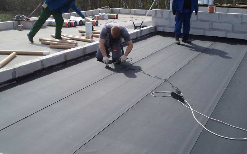 - Après cela, le toit est recouvert d'une étanchéité au rouleau. Les coutures du ruban isolant sont montées en série, se chevauchant, pour éviter toute pénétration d'humidité.