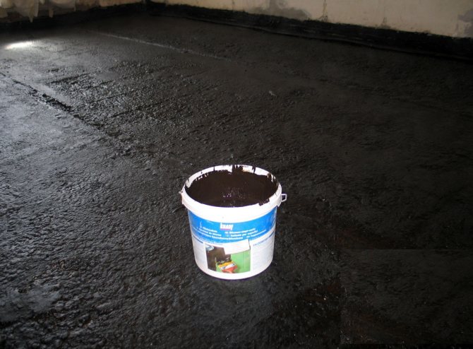 La chape brute préparée est recouverte de bitume liquide (apprêt), en enduisant particulièrement soigneusement les coins et en capturant 5 cm des murs. Sur une telle base traitée au bitume, des bandes de matériau de toiture sont collées avec un chevauchement de 10 cm et un chevauchement de 5 cm des murs. Aux endroits de chevauchement, les bandes sont chauffées avec un sèche-cheveux ou enduites de mastic bitumineux.