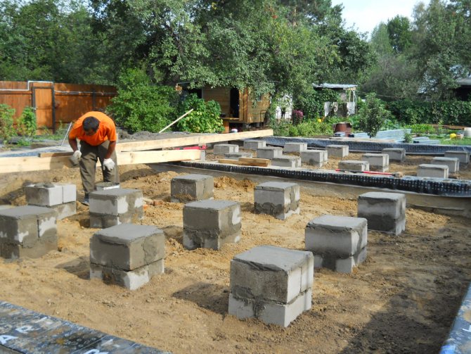 En guise de décalage, des grumes sciées en deux moitiés sont utilisées, des barres avec un rapport d'aspect de 1: 1,5, des planches double épaisseur de conifères. Si les bûches n'ont pas été montées lors de la fixation de la fondation, elles peuvent être placées sur un sol préparé ou sur des poteaux en brique sur une base en béton.