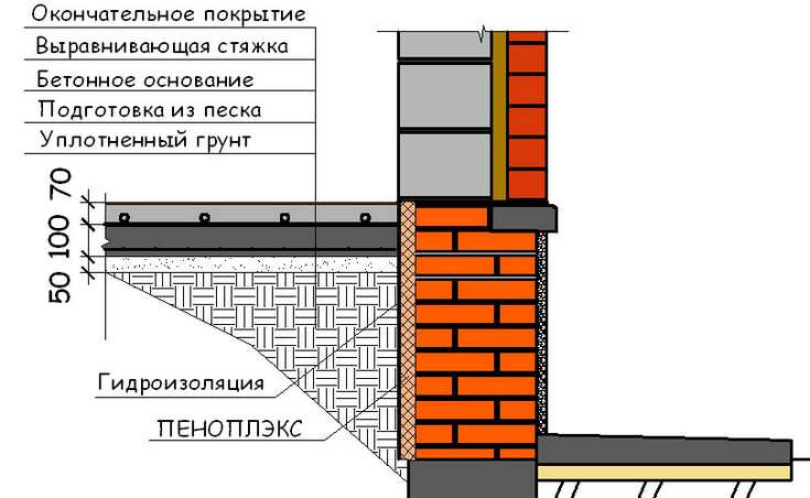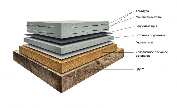 La pose du matériau de plancher peut être réalisée de la même manière sur la base en béton de la dalle de type chape, bois ou monolithique. Si une dalle de béton est fabriquée, elle doit être fixée à la fondation à l'aide d'un renforcement, sinon elle flottera. Dans le cas de l'installation d'un sol sur le sol lui-même, une dalle de gravier primaire est réalisée.