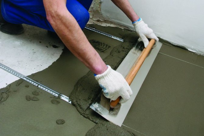 Pour elle, vous pouvez commander du béton «maigre» prêt à l'emploi ou fabriquer votre propre mortier en mélangeant du ciment M500 avec de la pierre concassée et du sable dans un rapport volumique de 1: 4: 3. De la fibre métallique est également ajoutée au mélange à raison de 1 à 1,5 kg pour 1 m3 de solution. Le mortier peut être coulé en s'alignant avec des phares ou avec des marques sur les murs de la fondation. Il convient de garder à l'esprit que la surface horizontale plane de la chape rugueuse simplifiera les étapes ultérieures du revêtement de sol.