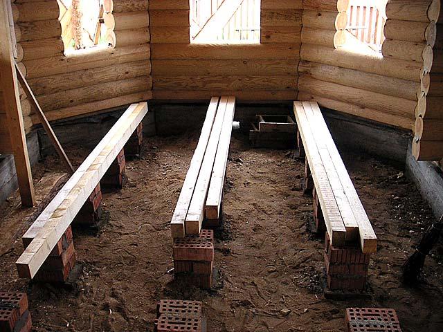 L'installation du sol au sol à l'aide de poutres en bois se fait en plusieurs étapes: