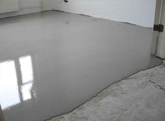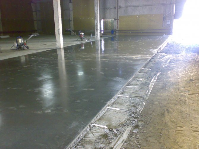 Après deux jours, le béton est repassé avec un mélange (10: 1) d'eau avec du verre liquide et du ciment sec. Ils le font comme ceci: humidifiez toute la surface de la chape avec un rouleau ou un pistolet pulvérisateur, puis saupoudrez-la d'une fine couche de ciment sec et frottez-la avec un flotteur dans le béton. Une telle technique augmentera la résistance du béton d'un ordre de grandeur et augmentera sa résistance à l'eau. La chape a besoin d'au moins 1,5 mois pour mûrir complètement, mais les travaux ultérieurs peuvent être effectués après 1 à 2 semaines.