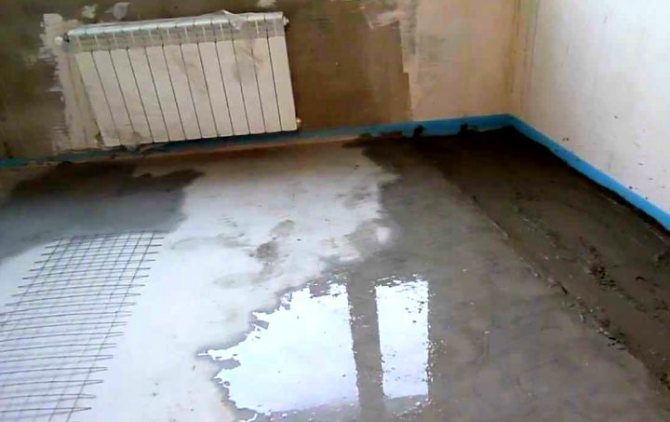 Le treillis de renfort est positionné de sorte qu'il soit dans la chape et ne dépasse pas sur sa surface. Pour ce faire, utilisez des supports, des morceaux de barres de bois, des profilés métalliques ou, par exemple, des bouchons de bouteilles en plastique. La combinaison de raccords et de balises de nivellement est une tâche assez difficile, il est donc recommandé de couler la chape le long de la marque sur les murs, puis de verser une fine couche de sol autonivelant par-dessus.
