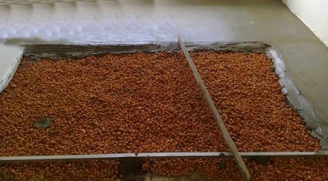 - Isolation. Vous pouvez isoler le sol avec de l'argile expansée, de la mousse de polystyrène extrudé, de la mousse. L'épaisseur des plaques de polystyrène et des feuilles de polystyrène dépend des conditions climatiques, mais pas moins de 5 cm L'argile expansée est recouverte d'une couche de 15 cm.