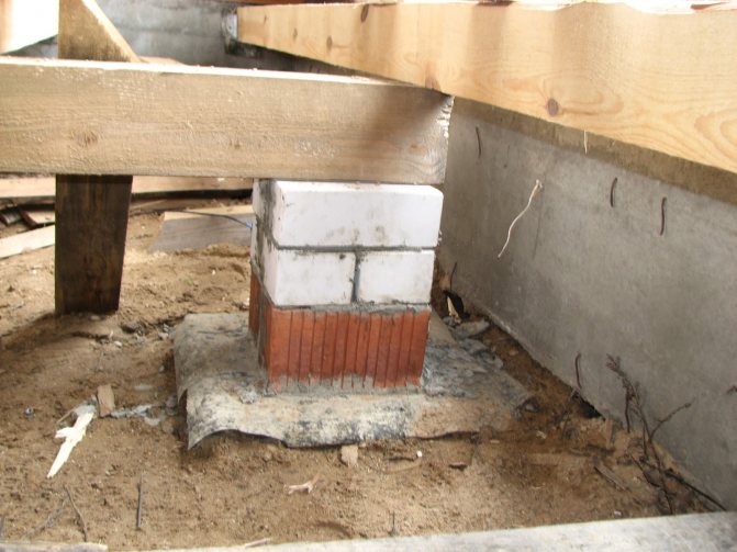 - Les poteaux de brique en 2 briques sont disposés strictement verticalement (le long d'un fil à plomb) sur le matériau de toiture de sorte que la dernière couche de briques soit perpendiculaire à la direction de la bûche. Pour obtenir une solution, le ciment M100 et le sable sont mélangés dans un rapport volumique de 1: 3 et de l'eau est ajoutée à l'œil nu.