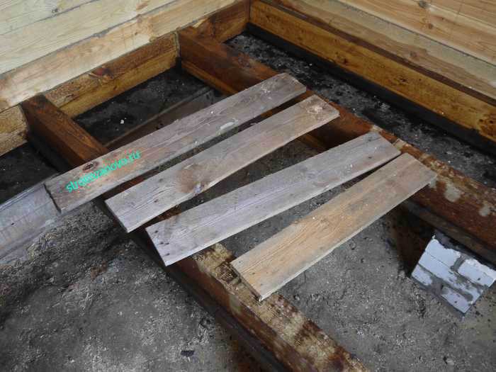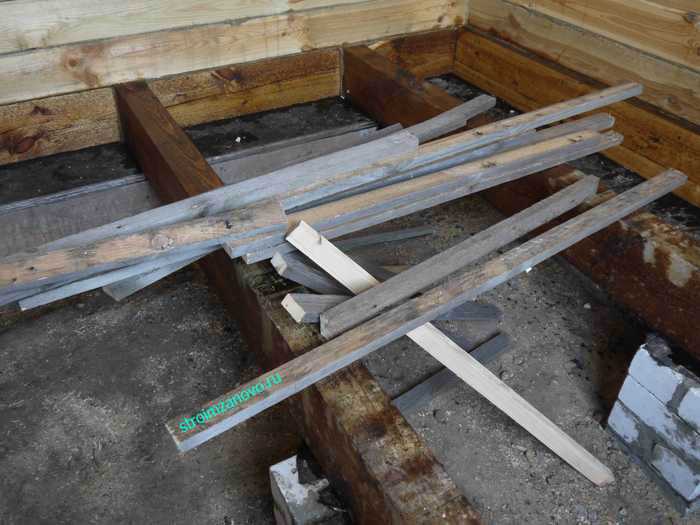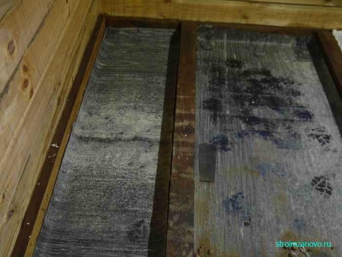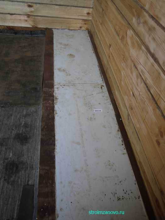 Ensuite, mesurez la distance entre les bûches et des planches d'une épaisseur d'au moins 2 cm ou du contreplaqué, coupez les segments nécessaires et posez-les sur les barres. Les boucliers sont également traités à l'huile. Vous obtiendrez une surface plane sur laquelle l'isolation est posée. Un inconvénient important de cette méthode d'isolation des planchers en bois dans une maison est une réduction significative de la couche isolante. Considérez vous-même: la hauteur des barres est de 4 cm + la hauteur de la planche est de 2 cm, plus les espaces - il s'avère que moins 6-7 cm Il s'avère que sur les 20 cm de la hauteur de la bûche , seuls 13 cm devront être isolés directement.