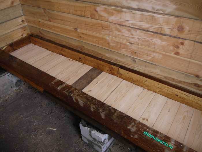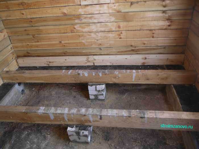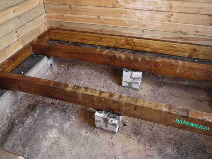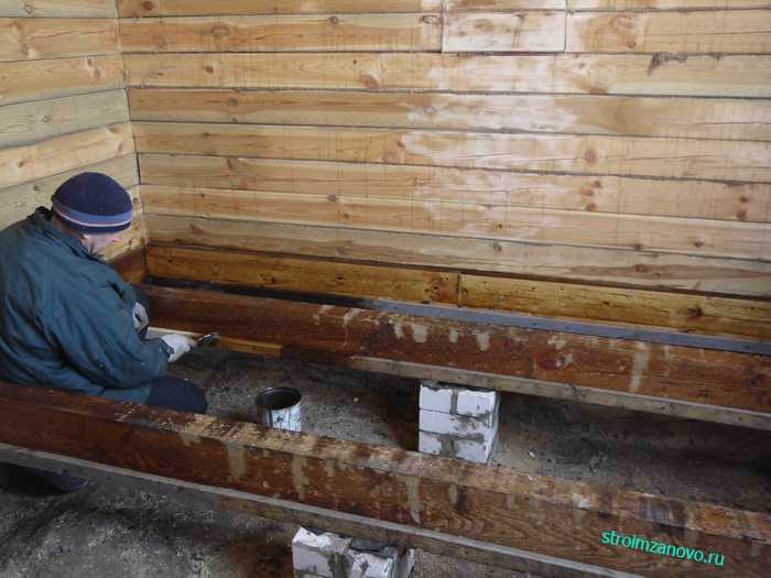 Tout d'abord, les éléments en bois sont traités avec un antiseptique pour les protéger de l'humidité de l'espace souterrain. Il serait plus correct de faire la ventilation du sous-plancher en faisant des trous dans la fondation. Mais tout de même, il faut antiseptiser le bois. Il existe de nombreux composés protecteurs, différents fabricants et propriétés. Mais l'option la plus abordable et la plus économique, avec d'excellentes qualités de résistance à l'humidité, est l'huile moteur usagée. Pour faciliter l'utilisation, le récipient contenant de l'huile doit être légèrement chauffé pour le rendre plus liquide et l'appliquer sur des pièces en bois avec un simple pinceau.
