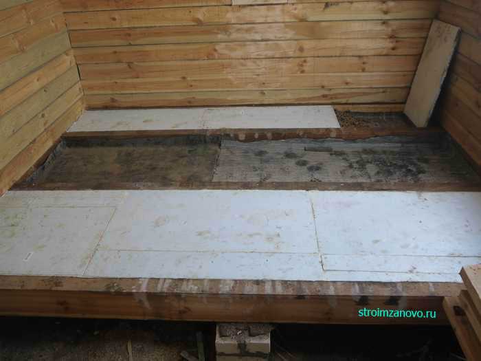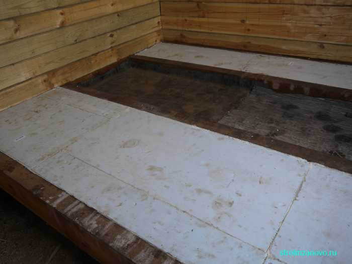 L'isolation thermique d'un parquet de cette manière comprend : une lame de 2 cm en dessous, puis une couche de matériau de toiture, puis de la terre cuite, puis du polystyrène expansé à partir de 3 cm, à la fin une lame de 4 cm.Vous aurez également besoin beaucoup d'huile moteur usagée ou un antiseptique et plusieurs bidons de mousse polyuréthane. L'épaisseur de ces matériaux est suffisante pour maintenir une température confortable dans la pièce. L'essentiel est de ne pas laisser de vide lors de l'installation d'une couche isolante, qui doit être soit moussée, soit bouchée (calfatée) avec du remorquage.