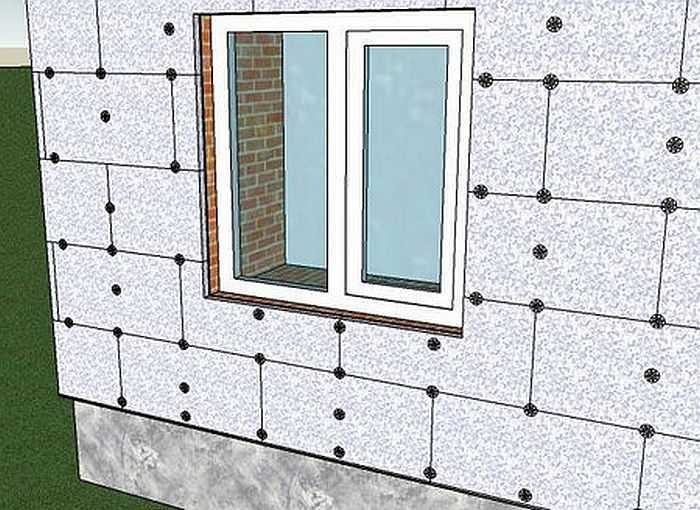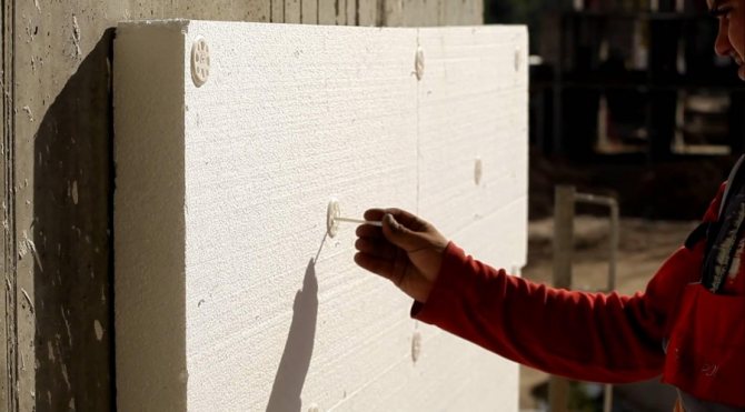 Tout d'abord, des trous sont percés pour l'installation des chevilles; 5 attaches sont nécessaires pour chaque plaque isolante. Pour mettre la plaque d'isolation thermique sur le support, des trous y sont percés. L'isolation est fixée de gauche à droite et de bas en haut. Les espaces entre les dalles sont scellés avec le même matériau.