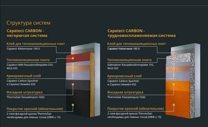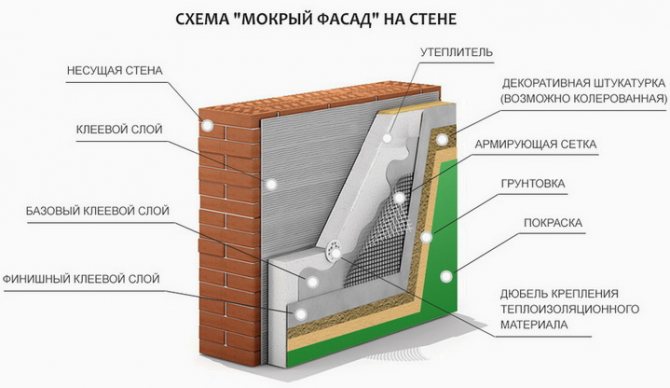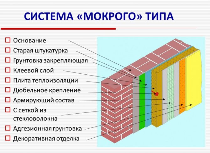 La seule différence est la préparation de la surface pour la peinture. Dans ce cas, le traitement doit être effectué avec un apprêt contenant du sable de quartz. Ainsi, il est possible de réaliser la création d'un revêtement isolant thermique de haute qualité et durable avec un procédé humide. Ce sont ces éléments qui composent la façade humide. De plus, vous pouvez mentionner les matériaux de finition. C'est un enduit et une peinture décoratifs ou conventionnels pour donner à la surface un type de construction fini.