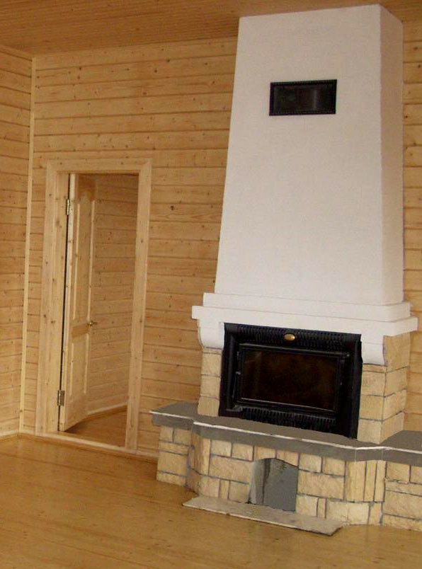 Décoration de cheminée avec plaques de plâtre dans une maison en rondins - Deuxièmement, malgré la finition naturelle du bois, dans tous les cas, une finition supplémentaire des surfaces extérieures des locaux sera nécessaire: une salle de bain, une salle de bain et une cuisine. Les murs de ces pièces seront exposés à une humidité plus élevée, ce qui détériorera le matériau.