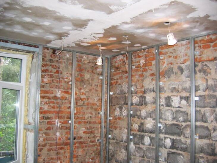 Dans ce cas, l'installation de cloisons sèches dans une telle situation diffère dans la méthode de fixation du revêtement au mur.