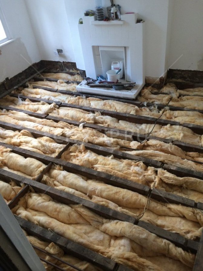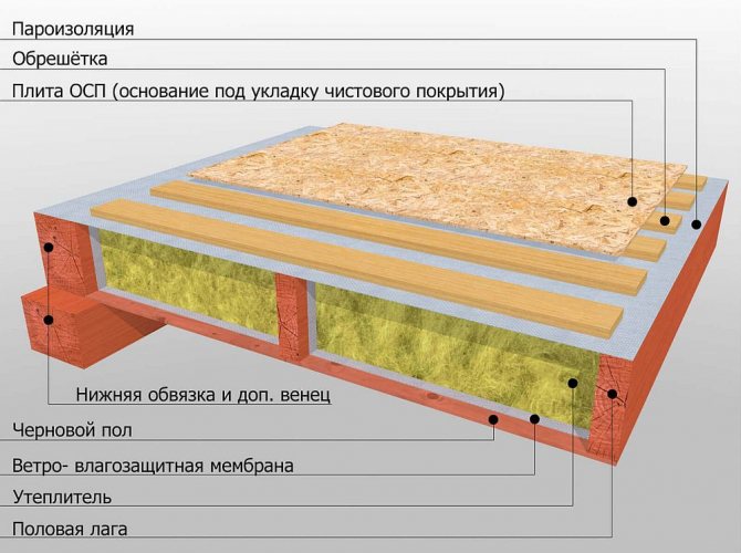 De plus, entre les bûches, une isolation est placée et au-dessus du sous-plancher fait de planches ou de contreplaqué. Tout revêtement de sol final peut être posé sur le sol isolé, si nécessaire. Mais vous devez le faire après avoir isolé les murs.