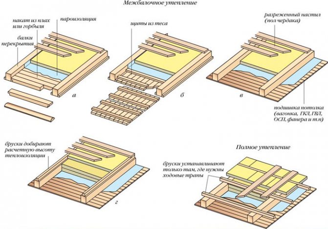 L'isolation thermique du système de chevrons et les poutres qui se chevauchent sont similaires. Nous partons du fait que le système de chevrons est assemblé et recouvert de matériau de toiture et que les poutres du plancher du grenier sont ourlées par le bas avec un sol rugueux.
