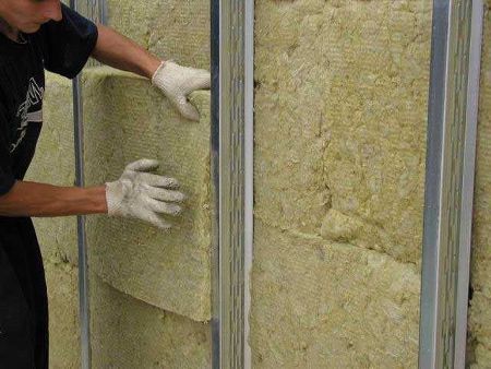 Il est à noter que la laine minérale, qui se présente en rouleaux, est empilée verticalement et que l'isolation des carreaux est placée entre les barres de revêtement elles-mêmes. La fixation du matériau est réalisée à l'aide de clous d'ancrage. Il ne doit y avoir aucun espace ni fissure à la surface du matériau. La structure doit être dense et uniforme.