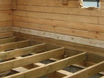 Les planchers en bois sont généralement fabriqués sur des rondins qui peuvent couper dans les rebords inférieurs du bâtiment ou y être fixés à l'aide de coins en acier renforcé. La première option implique la création de rainures et l'installation de bûches lors de la construction du mur.