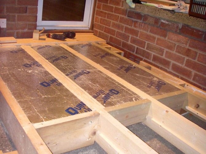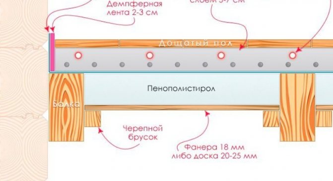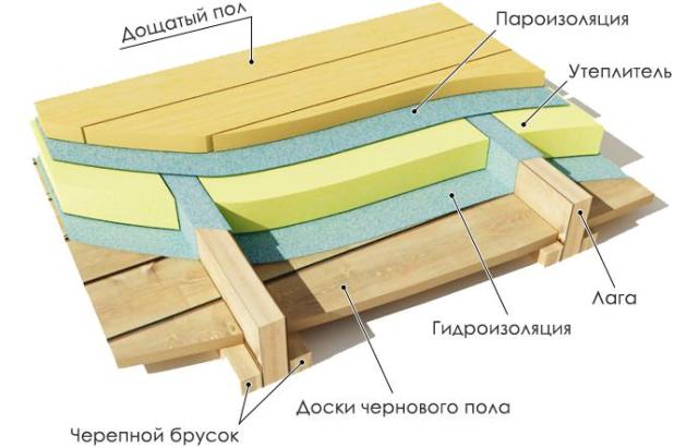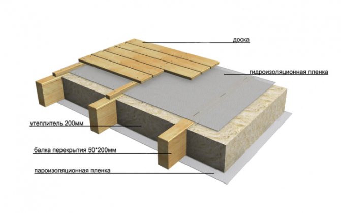 Le rôle des poutres peut être joué par des planches de grande épaisseur posées sur le bord, mais il s'agit le plus souvent d'une poutre ordinaire, fixée de niveau dans un seul plan du sol. L'espace entre les décalages est rempli de matériaux isolants. Parfois, une couche d'isolation est située en dessous. Il sert de barrière supplémentaire contre une humidité élevée.