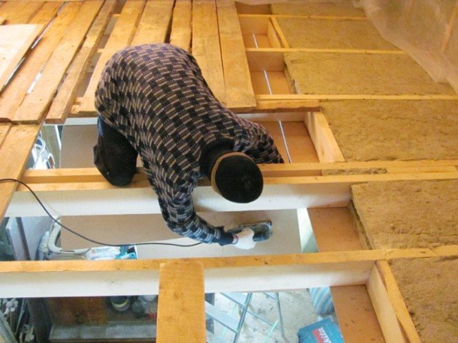 En outre, le chevauchement lui-même est formé en installant les planches de plancher de l'étage supérieur et en ourlant les matériaux du plafond du plancher inférieur.Vous pouvez souvent voir que les planches de plancher sont posées directement sur les poutres, mais il est plus correct de monter d'abord les bûches sur les poutres, puis de fabriquer le revêtement de sol des planches le long d'elles. La deuxième option est la plus préférable, car elle permettra de produire une isolation interfloor correcte sur des poutres en bois.