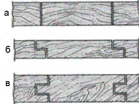 Types d'assemblage des lames de plancher: a - "dans un joint lisse", b - se chevauchant, c - rainure-tenon (languette)