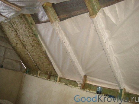 - Comme mentionné ci-dessus, lors de l'utilisation d'un isolant organique, une couche d'imperméabilisation est nécessaire. Dans ce cas, la solution la plus rationnelle est une membrane étanche à l'humidité. Il offre non seulement une protection contre la condensation, mais permet également aux murs de rester «respirants».