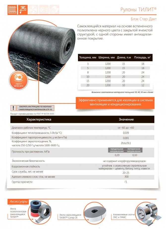 Rouleaux TILIT Black Star Duck et Black Star Duck Al - est une isolation thermique professionnelle à base de mousse de polyéthylène, avec une couche auto-adhésive pour l'isolation thermique et phonique des conduits d'air, des systèmes de ventilation et de climatisation, des conteneurs métalliques à des fins diverses. Il protège de manière fiable les structures contre les pertes de chaleur et empêche la formation de condensation; c'est un isolant efficace pour absorber le bruit et les vibrations. Il est très facile à installer, ne nécessite aucun moyen supplémentaire pour la fixation. La couche adhésive assure une fixation fiable de l'isolation thermique sur n'importe quelle surface, n'importe quelle configuration. TILIT Black Star Dact est un isolant en rouleau auto-adhésif sans revêtement, et TILIT Black Star Dact AL est un isolant auto-adhésif similaire avec un revêtement externe unilatéral avec une feuille d'aluminium naturelle, qui offre une protection supplémentaire de l'isolant contre les ultraviolets. rayonnement et augmente l'efficacité de l'isolation grâce à l'effet réfléchissant.