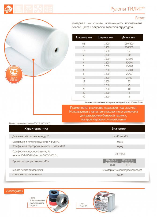 Rouleaux et tapis TILIT Basis - isolation de base à base de mousse de polyéthylène, à structure cellulaire fermée, blanc. Il est produit sous forme de rouleaux et de nattes, en fonction de l'épaisseur de l'isolant. Il est utilisé pour l'isolation thermique des équipements et des canalisations, l'isolation phonique de diverses structures, comme matériau de rembourrage dans la construction et dans la production de biens de consommation, comme matériau d'emballage pour les appareils électroménagers, les meubles, la vaisselle et autres articles fragiles, pour le production de divers produits de sport, équipements de sauvetage et flottants, etc.