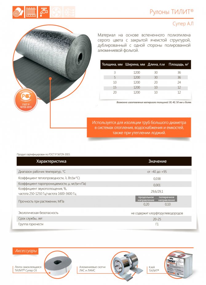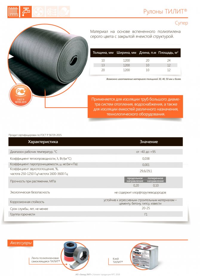 Rouleaux TILIT Super - matériau calorifuge, à base de mousse de polyéthylène, à structure cellulaire fermée. Il est utilisé pour l'isolation thermique efficace des tuyaux et des conteneurs de grand diamètre à des fins diverses, ainsi que pour l'isolation thermique et l'isolation phonique de diverses structures de bâtiment. Une très faible conductivité thermique, une perméabilité absolue à l'humidité et à la vapeur, une flexibilité élevée, une élasticité et une résistance à la compression font de TILIT Super isolation un isolant thermique unique! Fabrication et facilité d'installation, durabilité inégalée, sécurité environnementale totale - tels sont les avantages incontestables de l'isolation thermique à base de mousse de polyéthylène. L'isolation en mousse de polyéthylène TILIT Super est recommandée pour une utilisation comme isolation thermique et phonique dans la construction de locaux résidentiels et industriels, dans les systèmes d'isolation thermique multicouches pour murs, cloisons, toitures, sols sous chape, etc.