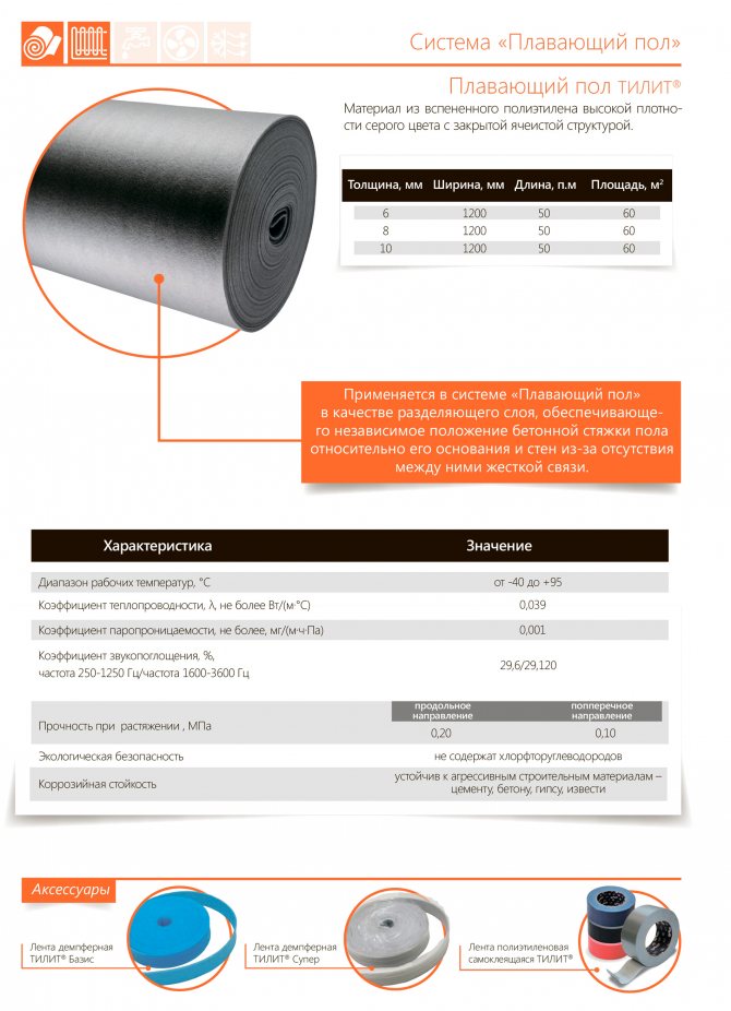 Rouleaux de plancher flottant TILIT Est un matériau d'isolation thermique et acoustique spécialisé et professionnel à base de mousse de polyéthylène haute densité, gris. Ce matériau isolant a été spécialement développé et certifié pour une utilisation dans les systèmes de plancher flottant, comme couche isolante efficace contre la chaleur et le bruit sous la chape. Il possède tous les tests et caractéristiques techniques nécessaires et éprouvés pour une utilisation comme joints insonorisants dans les structures de bâtiments, lors de l'installation de planchers flottants avec des exigences accrues en matière d'isolation du bruit d'impact.