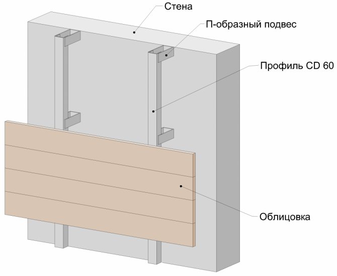 Le premier lattage constitué de suspensions en forme de U. Les cintres en forme de U sont fixés au mur avec des chevilles (si le mur est en brique ou en béton) et des vis autotaraudeuses (si le mur est un bloc), 2 attaches (vis autotaraudeuse ou cheville, selon le matériau du mur) pour chaque suspension. Le pas des suspensions verticalement est de 60 cm, horizontalement - selon le type de revêtement (62,5 ou 62 - OSB, LSU, 60 ou 40 - blockhaus et parement).