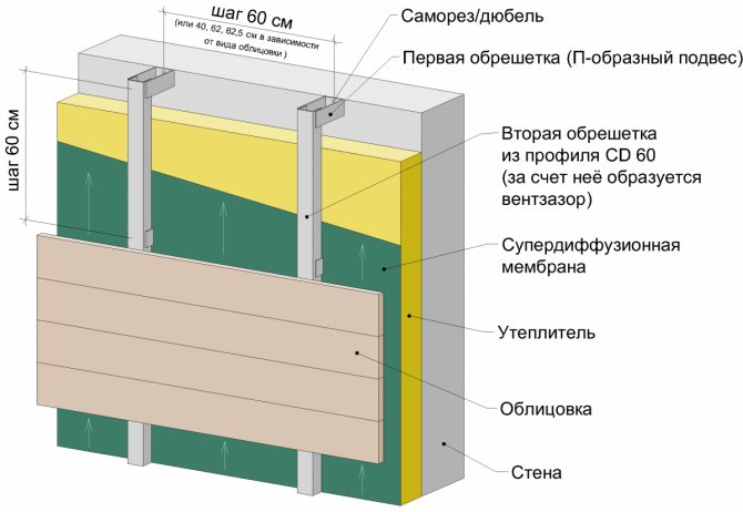 Ainsi, pour une façade ventilée non isolée, une barre de 30x40 mm est nécessaire pour le dispositif de lattage. En fait, seule la deuxième caisse est réalisée, la première (puisqu'il n'y a pas d'isolation) n'est pas nécessaire. Le schéma de l'appareil est illustré à la figure 2 ci-dessous.