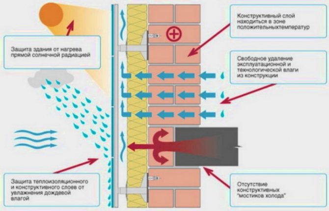 1) mur isolé; 2) le cadre de support, sur lequel le matériau de parement sera ensuite fixé; 3) isolation thermique minérale; 4) pare-vent; 5) espace d'air; 6) matériau de revêtement.