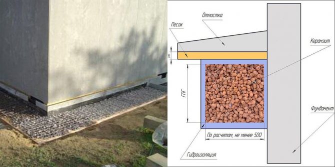 Tous les travaux sont effectués de la même manière que lors de l'isolation avec du polystyrène expansé, c'est-à-dire qu'une tranchée similaire est creusée, seul un imperméabilisant est posé sur son fond, sur lequel une couche d'argile expansée est versée sur le dessus. Après chaque couche coulée, un bourrage doit être effectué. Ensuite, une zone aveugle est faite sur le dessus, mais n'oubliez pas de mettre une pellicule plastique pour que l'eau de la solution ne pénètre pas dans l'argile expansée.