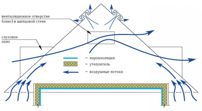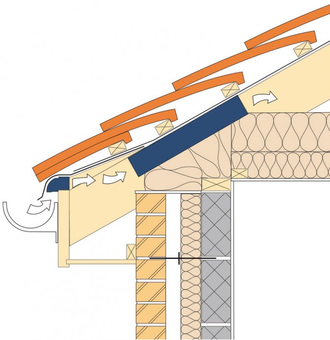 Sous les avant-toits du toit à chevrons, des bouches d'aération sont disposées à travers lesquelles le flux d'air frais et froid est fourni, tandis que l'air humide plus chaud ira dans les puits de lumière ou d'autres ouvertures technologiques dans la partie supérieure du pignon ou de la pente.