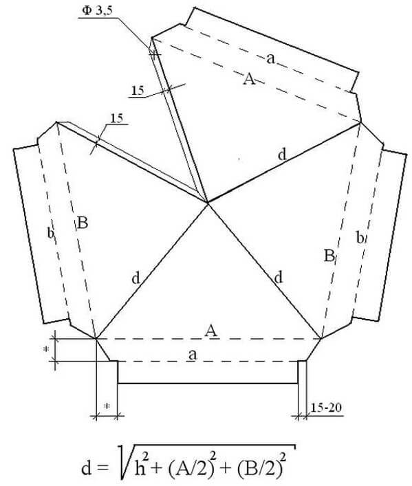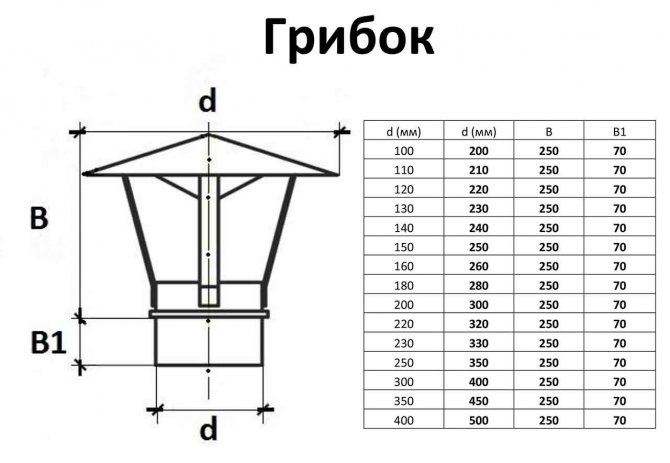 Le capuchon de la cheminée doit être facile à mettre, par conséquent, pour déterminer ses dimensions, il est nécessaire d'augmenter les plus grands paramètres linéaires du tuyau de 4 à 5 mm. Le support d'extension peut être à 90 degrés ou oblique.